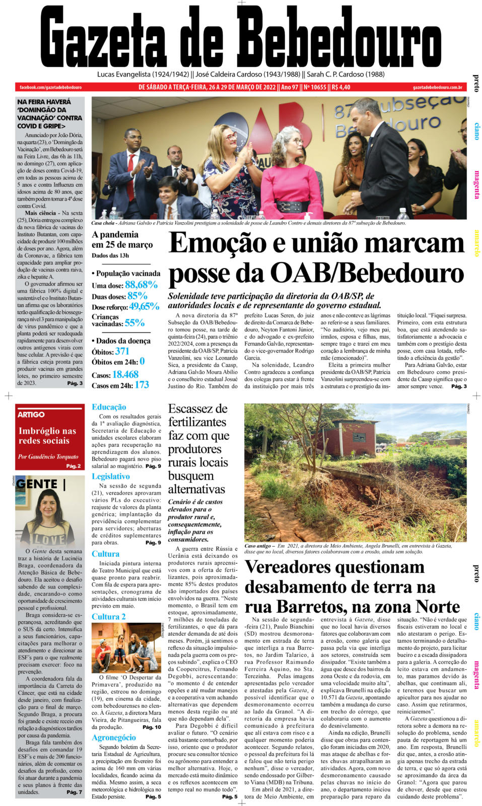 A nova diretoria da 87ª Subseção da OAB/Bebedouro tomou posse, na tarde de quinta-feira (24), para o triênio 2022/2024, com a presença da presidente da OAB/SP, Patrícia Vanzolini, seu vice Leonardo Sica, a presidente da Caasp, Adriana Galvão Moura Abílio e o conselheiro estadual Josué Justino do Rio. Também do prefeito Lucas Seren, do juiz de direito da Comarca de Bebedouro, Neyton Fantoni Júnior, e do advogado e ex-prefeito Fernando Galvão, representando o vice-governador Rodrigo Garcia.