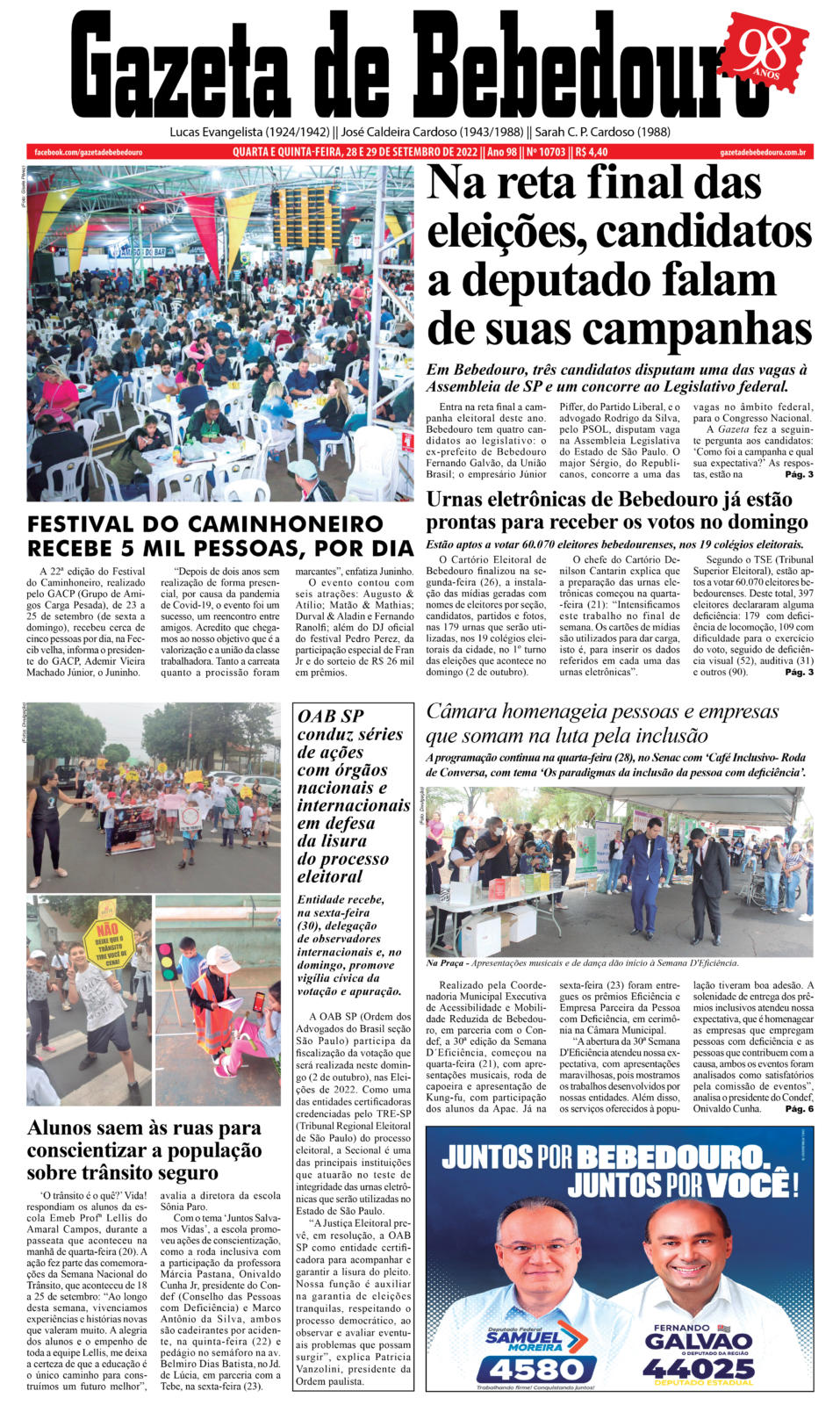 Entra na reta final a campanha eleitoral deste ano. Bebedouro tem quatro candidatos ao legislativo: o ex-prefeito de Bebedouro Fernando Galvão, da União Brasil; o empresário Júnior Piffer, do Partido Liberal, e o advogado Rodrigo da Silva, pelo PSOL, disputam vaga na Assembleia Legislativa do Estado de São Paulo. O major Sérgio, do Republicanos, concorre a uma das vagas no âmbito federal, para o Congresso Nacional.