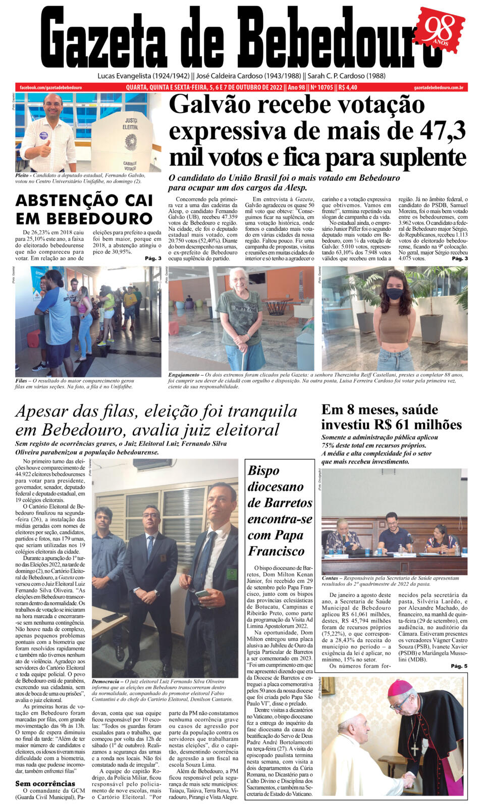 Concorrendo pela primeira vez a uma das cadeiras da Alesp, o candidato Fernando Galvão (UB), recebeu 47.359 votos de Bebedouro e região. Na cidade, ele foi o deputado estadual mais votado, com 20.750 votos (52,40%). Diante do bom desempenho nas urnas, o ex-prefeito de Bebedouro ocupa suplência do partido.