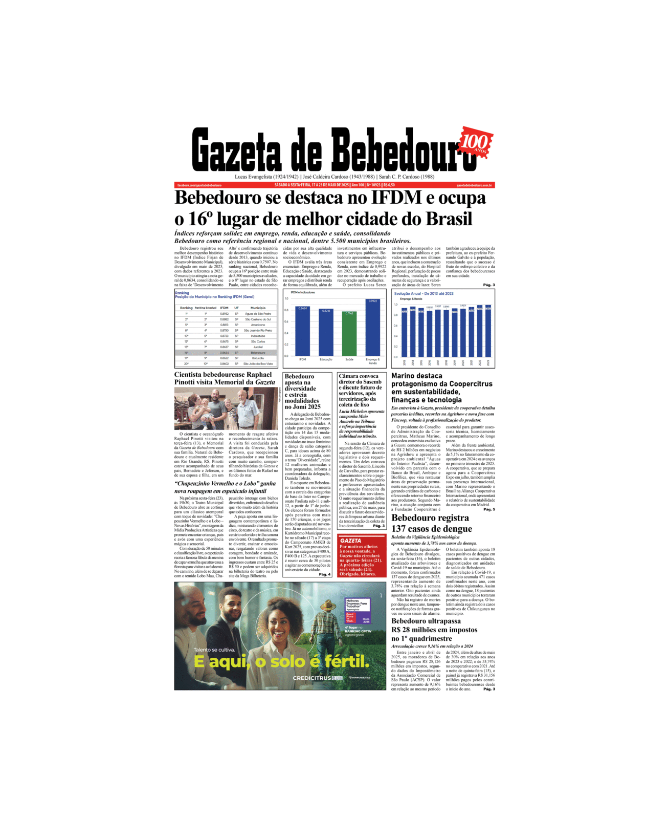 Índices reforçam solidez em emprego, renda, educação e saúde, consolidando Bebedouro como referência regional e nacional, dentre 5.500 municípios brasileiros.