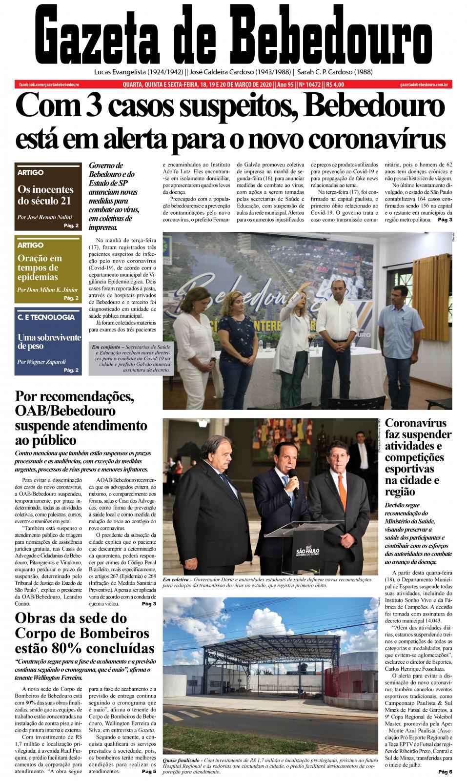Preocupado com a população bebedourense e a prevenção de contaminações pelo novo coronavírus, o prefeito Fernando Galvão promoveu coletiva de imprensa na manhã de segunda-feira (16), para anunciar medidas de combate ao vírus, com ações a serem tomadas pelas secretarias de Saúde e Educação, com suspensão de aulas da rede municipal. Alertou para os aumentos injustificados de preços de produtos utilizados para prevenção ao Covid-19 e para propagação de fake news relacionadas ao tema.