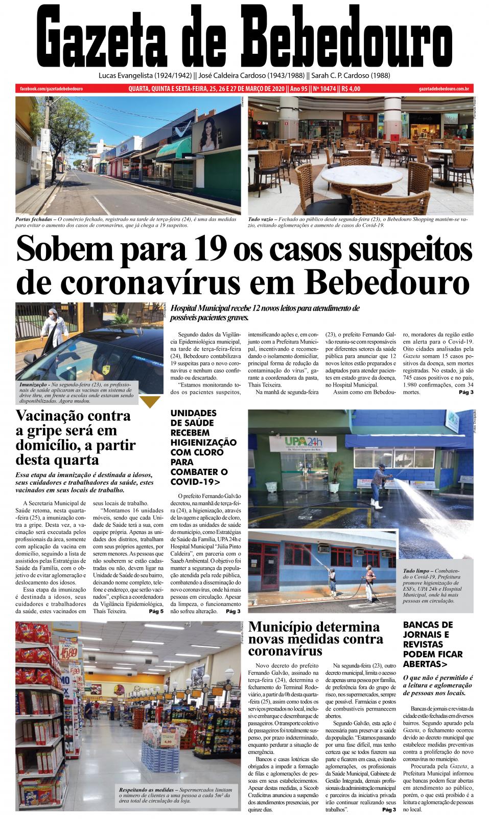 Assim como em Bebedouro, moradores da região estão em alerta para o Covid-19. Oito cidades analisadas pela Gazeta somam 15 casos positivos da doença, sem mortes registradas. No estado, já são 745 casos positivos e no país, 1.980 confirmações, com 34 mortes.