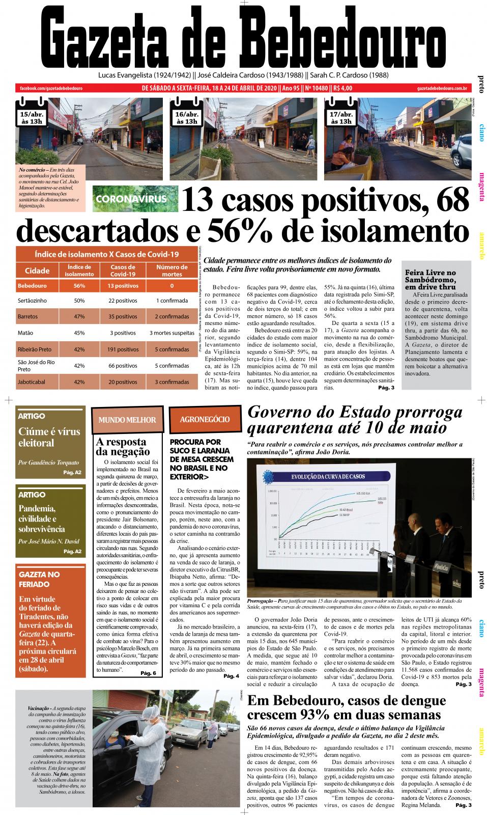 Bebedouro está entre as 20 cidades do estado com maior índice de isolamento social, segundo o Simi-SP: 59%, na terça-feira (14), dentre 104 municípios acima de 70 mil habitantes. No dia anterior, na quarta (15), houve leve queda no índice, quando passou para 55%. Já na quinta (16), última data registrada pelo Simi-SP, até o fechamento desta edição, o índice voltou a subir para 56%.