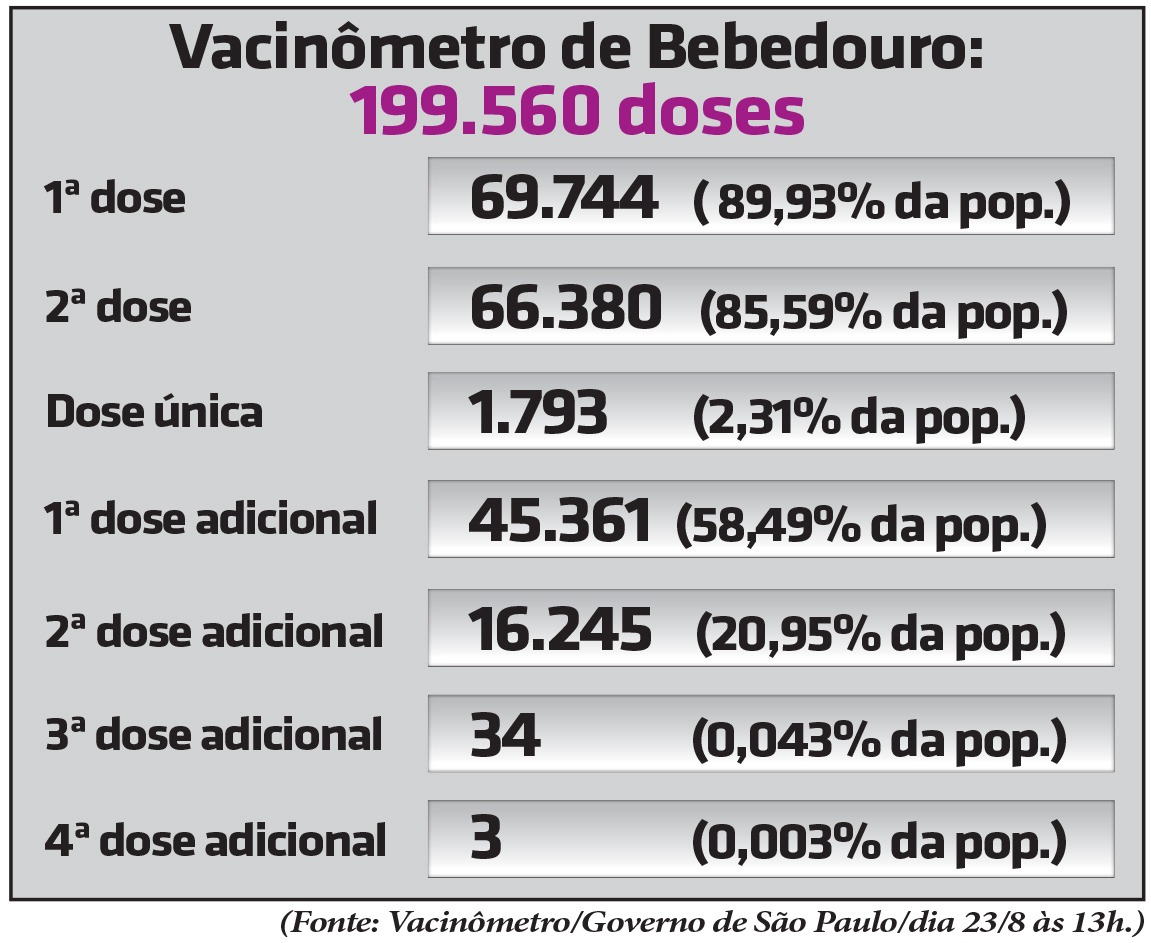 Vacinômetro – Atualizado pelo Governo de São Paulo na terça-feira (23), o vacinômetro apontava 69.744 pessoas vacinadas com a primeira dose em Bebedouro (89,93% da pop.); 66.380 (85,59% da pop) e 45.361 (58,49% da pop) foram imunizadas com as doses adicionais.