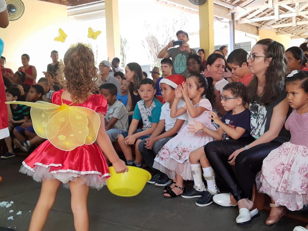 No pátio da instituição, os alunos foram recepcionados pelo “Natal Encantado”, coordenado pela voluntária Gabriela Padovan. Com encenação de peças e musicais infantis, passando por Frozen, Moana, Chapeuzinho Vermelho, os alunos vibraram com a Galinha Pintadinha e Baby Shark, acompanhando o grupo nas coreografias. Entretanto, o que encantou e fez seus olhinhos brilharem foi a chegada do Papai e da Mamãe Noel.