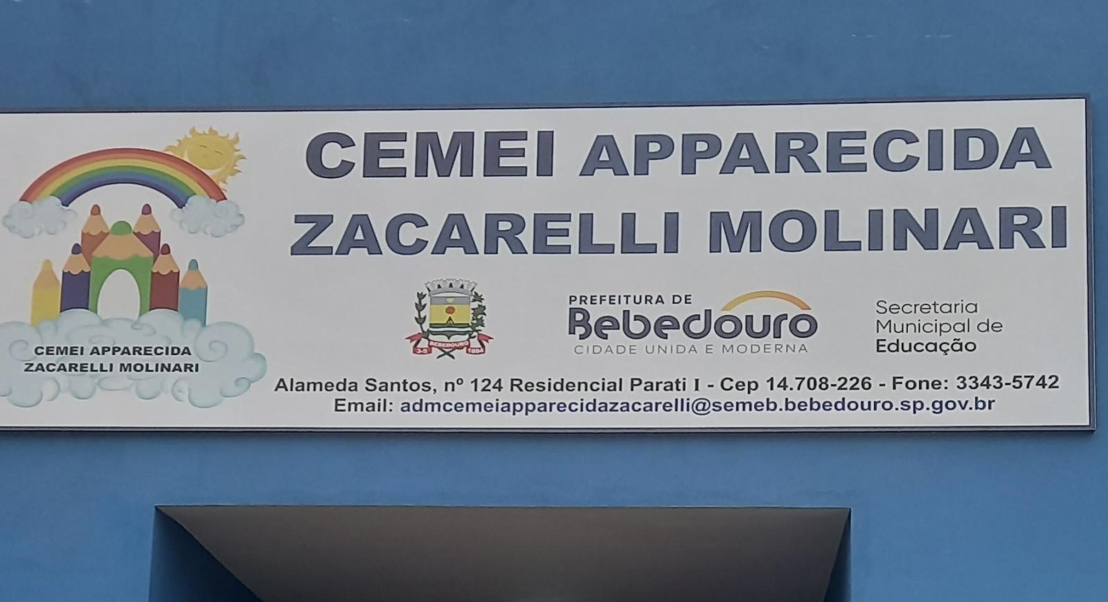 A Cemei Apparecida Zacarelli Molinari, no Resid. Parati I, na zona norte da cidade foi inaugurada na tarde de sexta-feira (27), com investimentos de mais de R$ 3 milhões de recursos da prefeitura. A cerimônia contou com a presença do prefeito Lucas Seren, acompanhado da vice Sebastiana Tavares, da primeira dama Cristiane Seren e também com participação da secretária de Educação, Angélica Massaro, do secretário de Esportes, Joel Monteiro e dos profissionais da unidade e da pasta Educação. Maximiliano Zacarelli representou os familiares da patronesse da escola.