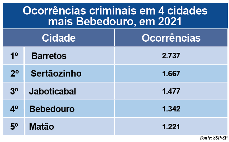 A Gazeta preparou comparativo das estatísticas criminais, após divulgação pela SSP/SP (Secretaria de Segurança Pública do Estado de São Paulo), dos dados referentes a Bebedouro e outras quatro cidades da região: Jaboticabal, Matão, Sertãozinho e Barretos. Nos 12 meses do ano passado, o total de delitos na região foi de 8.444, aumento de 13,64% em relação a 2020, que teve 7.430 ocorrências.