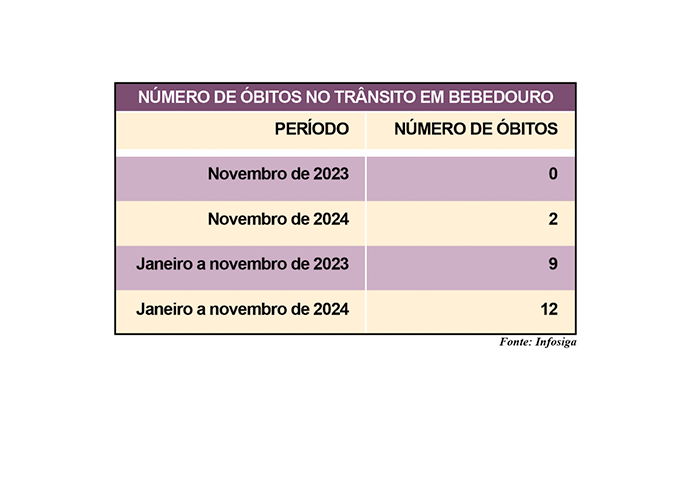 Dados do Infosiga, painel do governo do Estado de São Paulo, que contabiliza mortes em rodovias e vias municipais por acidentes de trânsito, divulgados no final de dezembro de 2024, referentes a novembro, mostram que duas pessoas perderam a vida após sofrerem acidentes de trânsito no penúltimo mês do ano passado. As duas vítimas eram do sexo feminino, de 23 anos e de 31 anos.
