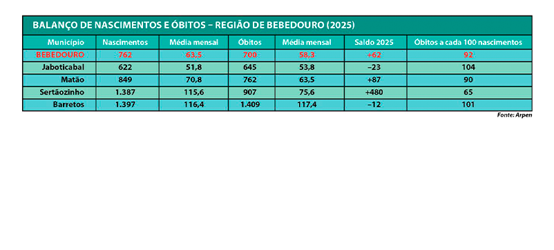 Os dados do Portal da Transparência do Registro Civil, mantido pela Arpen Brasil, mostram que o comportamento demográfico em 2025 variou de forma significativa entre os principais municípios da região de Bebedouro. Enquanto algumas cidades encerraram o ano com saldo positivo entre nascimentos e óbitos, outras registraram mais mortes que novos registros de nascimento, evidenciando realidades distintas no crescimento populacional regional. A Gazeta analisou o balanço dos registros nos cartórios de Bebedouro, Jaboticabal, Matão, Sertãozinho e Barretos.