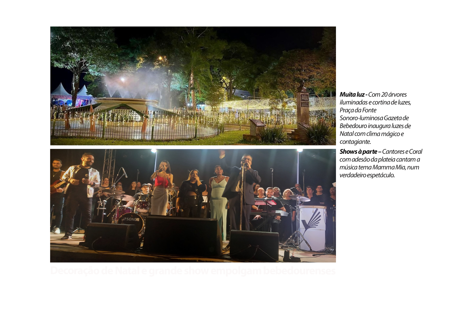 No sábado (25), a Prefeitura Municipal inaugurou o Natal Iluminado na Praça da Fonte Sonoro-luminosa Gazeta de Bebedouro com shows de artistas da cidade, interpretando canções inesquecíveis do cinema e do teatro. No domingo (26), houve a inauguração da Árvore de Natal Flutuante, juntamente com a decoração da praça Santa Paula Frassinetti, com mais decoração natalina, dessa vez, na região do Lago Artificial.