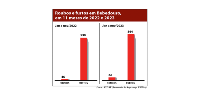 Dados da SSP/SP (Secretaria de Segurança Pública do Estado de São Paulo), referentes ao período de janeiro a novembro de 2023, mostram que os roubos aumentaram na cidade em relação a 2022. Foram cinco crimes deste tipo registrados em novembro, mesma quantidade de outubro e, no acumulado de 11 meses, este tipo de delito aconteceu 86 vezes. No mesmo período de 2022, a cidade havia registrado 46 roubos em geral, apresentando crescimento de 86,95% entre os anos. Os roubos de veículo somam 11 casos no ano passado, com uma ocorrência em novembro. Em 2022, este tipo de crime havia acontecido 20 vezes, queda de 45%.