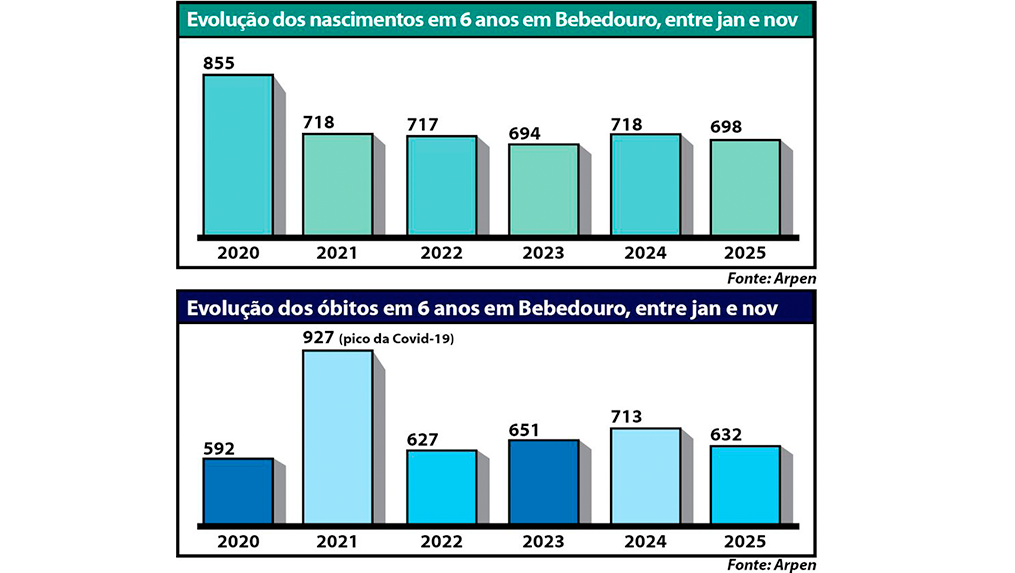 Os dados do Portal da Transparência do Registro Civil, da Arpen-Brasil, revelam o comportamento demográfico de Bebedouro no acumulado de janeiro a novembro de 2025. O município registrou menos nascimentos e menos óbitos em comparação ao mesmo período de 2024, acompanhando a tendência estadual e nacional de queda no ritmo populacional.