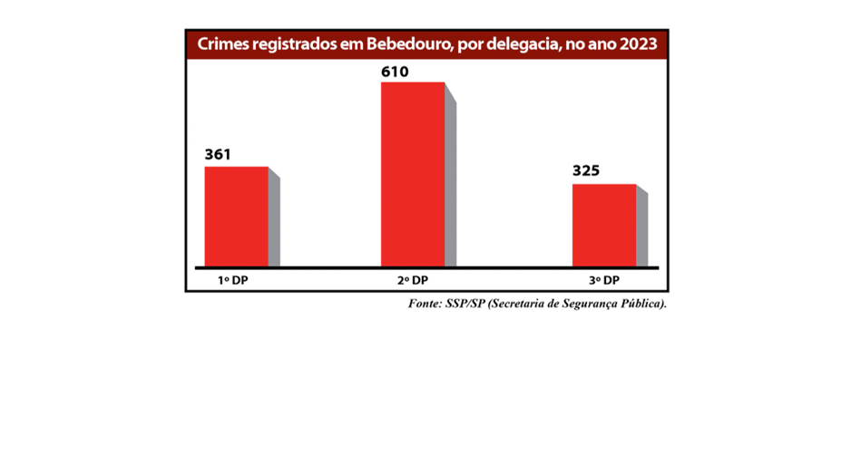 A zona Norte de Bebedouro segue sendo a campeã em registros de ocorrências criminais. Dados da SSP/SP (Secretaria de Segurança Pública do Estado de São Paulo) informam que no 2º Distrito Policial da cidade foram computados, entre janeiro e dezembro de 2023, 610 dos 1.296 registros feitos pela polícia, representando 47,07% do total. No ano anterior, em 2022, a zona Norte da cidade também detinha o maior número de delitos, com 626 das 1.288 ocorrências, representando 48,60% do total registrado naquela ano.