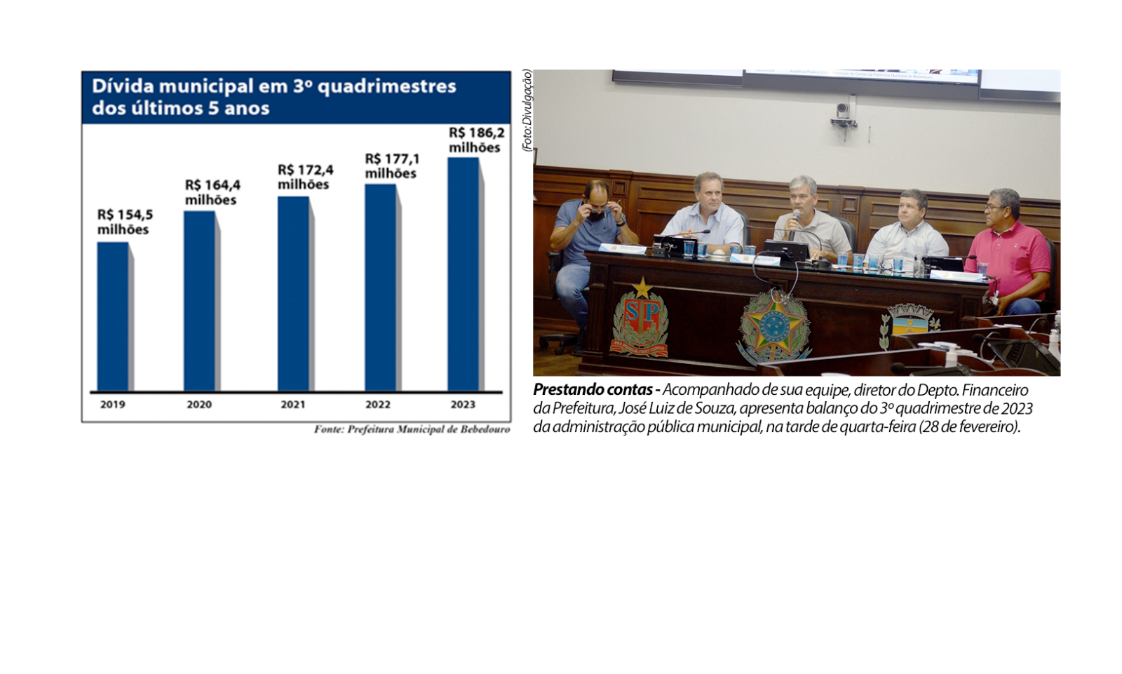 A Prefeitura de Bebedouro fechou o 3º quadrimestre de 2023, com dívidas de R$ 186,221 milhões, aumento de R$ 15,537 milhões, no comparativo com o 2º quadrimestre do ano, quando a dívida estava em R$ 170,683 milhões (+ 9,10%). O montante representa também alta de 5,11% em relação ao 3º quadrimestre de 2022 (R$ 177,154 milhões).