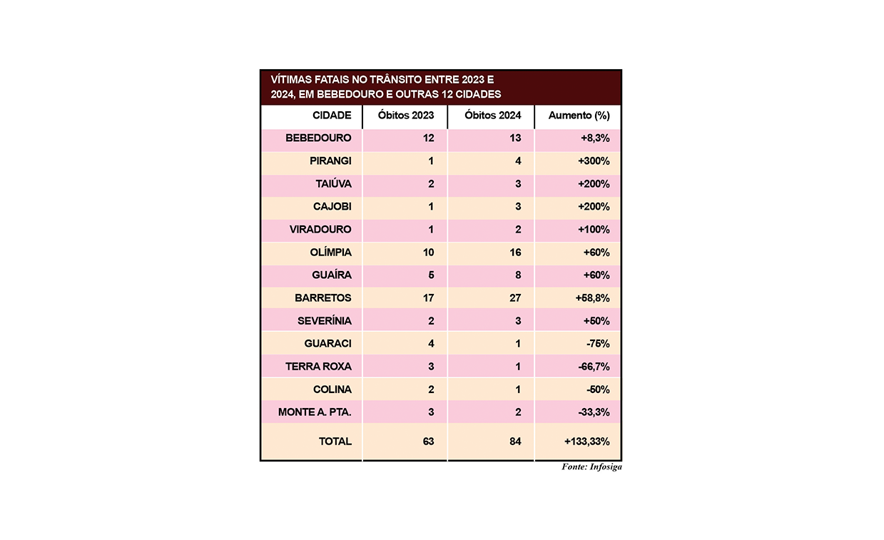 Dados do Infosiga, painel do governo do Estado de São Paulo, que mostra o número de mortes por acidentes de trânsito em vias e rodovias, detalham que em Bebedouro, cresceu 8,3% o número de vítimas de acidentes fatais, com 13 óbitos registrados em 2024 e 12 anotados em todo o ano de 2023, conforme adiantado pela Gazeta na edição 10.898, de quarta-feira (22).