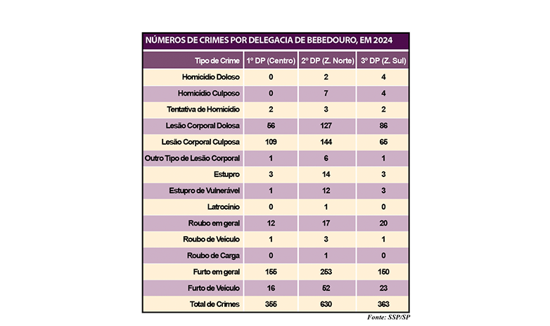 Os índices de criminalidade em Bebedouro, divulgados pela SSP/SP (Secretaria de Segurança Pública do Estado de São Paulo), registrados ao longo de 2024, revelam que a zona Norte lidera o ranking da criminalidade na cidade, concentrando 46,70% dos casos registrados. A zona Sul aparece em segundo lugar, com 26,91% das ocorrências, enquanto o Centro responde por 26,32% dos crimes. No total, a cidade registrou 1.349 crimes entre janeiro e dezembro do ano passado.
