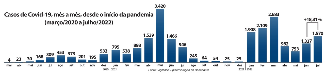 Em 29 dias de julho, os casos de Covid-19 em Bebedouro tiveram alta de 18,3% na comparação com todo o mês de junho, segundo dados da Vigilância Epidemiológica. Antes de chegar ao fim, julho registrou, conforme boletim divulgado na sexta-feira (29), 1.570 confirmações da doença – no mês anterior, foram 1.327 casos.