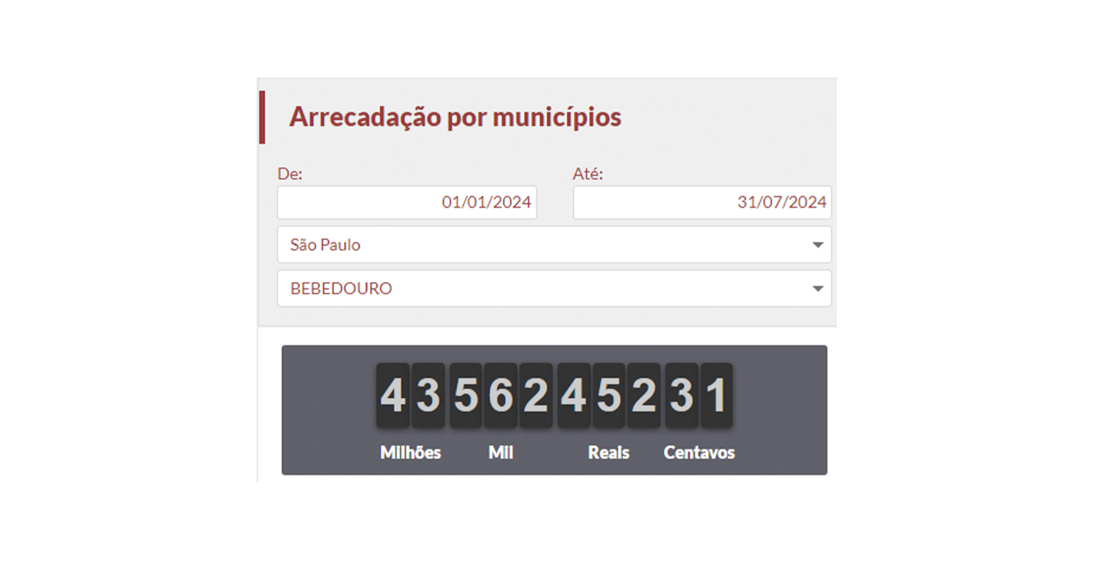Os bebedourenses desembolsaram R$ 43,562 milhões em impostos, de janeiro a julho de 2024, segundo a Associação Comercial de SP, cujo sistema, o Impostômetro, estima quanto de tributos foram pagos pelos paulistas aos governos federal, estadual e às cidades.