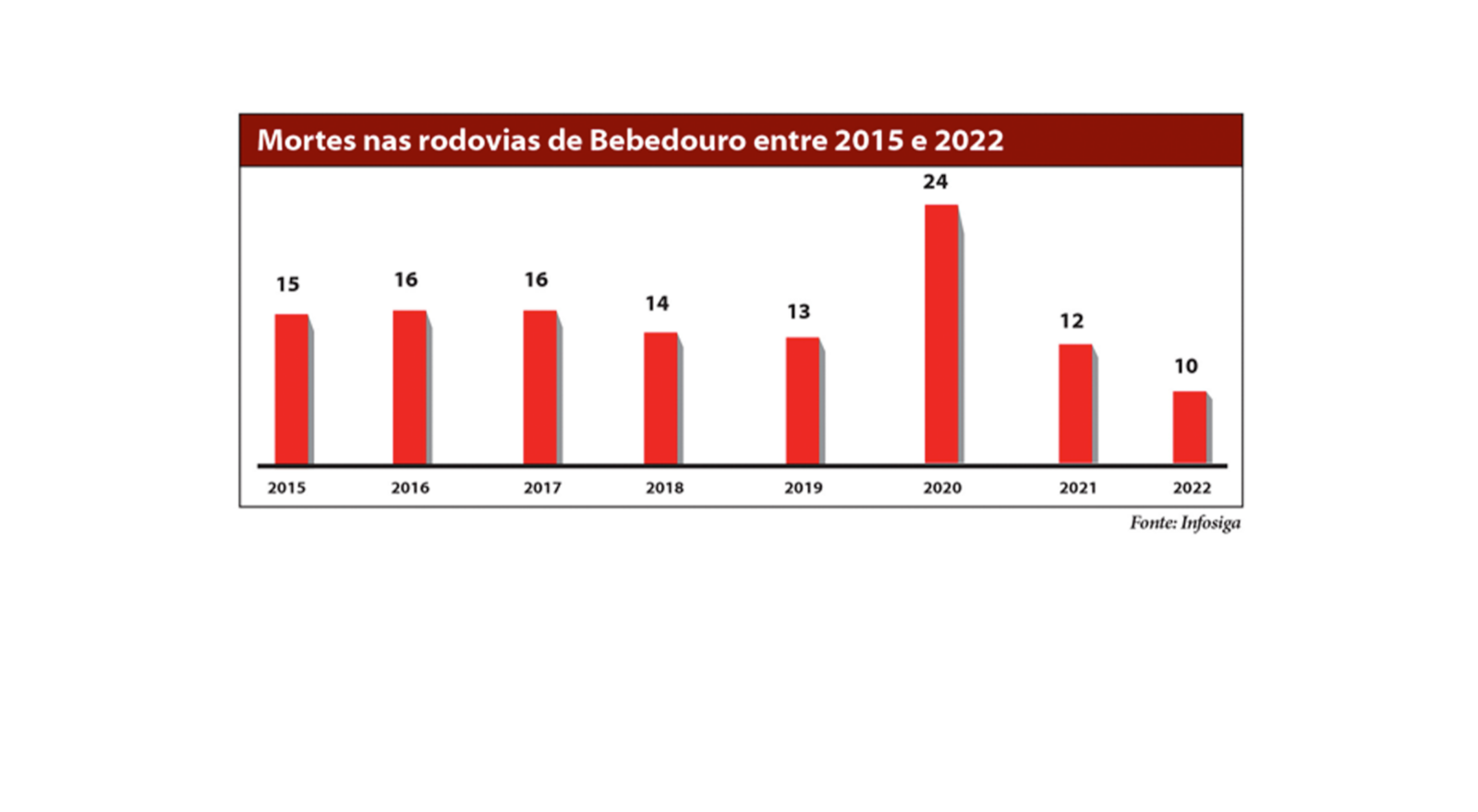 Dados do Infosiga mostram que Bebedouro, em 2022, teve o menor índice de mortes nas rodovias, desde quando este fator começou a ser medido pelo governo do Estado de São Paulo, em 2015, totalizando 10 vítimas fatais, nas rodovias que circundam o município.