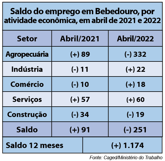 Dados do Caged (Cadastro Geral de Empregados e Desempregados), do Ministério da Economia, mostram que Bebedouro encerrou o mês de abril com desempenho negativo na geração de empregos, com contratação de 1.355 empregados com carteira assinada e demissão de 1.606, resultando em saldo de (-) 251 vagas e variação relativa de (-) 1,07%. De acordo com o painel do Caged, o saldo negativo é menor que a retração registrada em março de (-) 1.156 empregos.