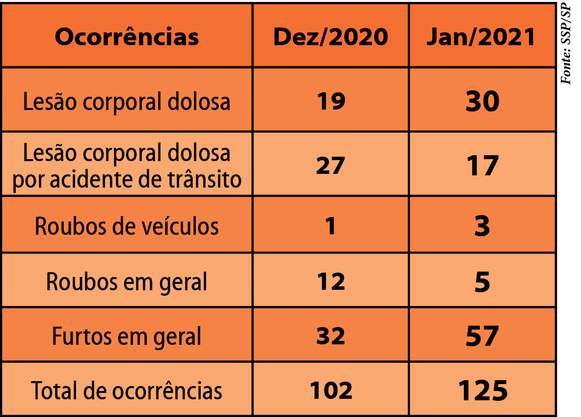 A SSP/SP (Secretaria de Segurança Pública) do Estado de São Paulo divulgou, na quinta-feira (25), as estatísticas criminais do primeiro mês deste ano, quando foram registradas 125 ocorrências contra 102, em dezembro, indicando alta de 22,54%, em Bebedouro. Já comparando-se com janeiro do ano passado, quando foram registrados 123 delitos, houve leve crescimento de 1,62%.