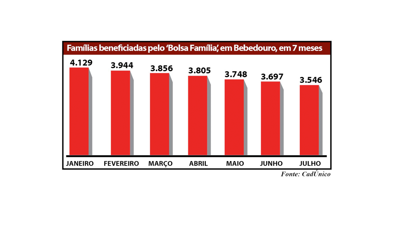O painel do CadÚnico do Governo Federal informa que o número de famílias que recebeu Bolsa Família em Bebedouro foi de 3.546, diminuição de 4,08% em relação a junho quando 3.697 famílias foram contempladas com o benefício. Este número está em constante queda desde o início do ano, pois em janeiro, o Governo Federal investiu em 4.129 famílias, mostrando queda de 14,11% em sete meses. Em fevereiro, este benefício foi pago a 3.944, caindo para 3.856, em março e para 3.805, em abril. Em maio, a queda seguiu com 3.748 famílias beneficiadas.