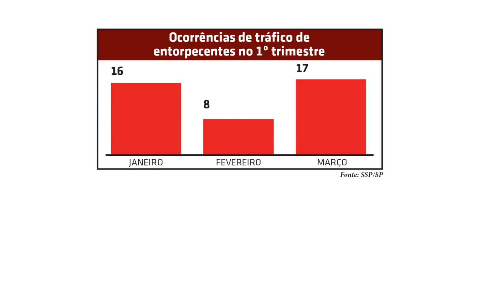 A polícia de Bebedouro registrou 17 ocorrências de tráfico de entorpecentes em março, crescimento de 112,5% em relação aos oito registros de fevereiro. Quando se compara com janeiro, há estabilidade, pois no primeiro mês do ano, a produtividade da polícia registrou 16 ocorrências deste tipo. Os dados são da SSP/SP (Secretaria de Segurança Pública do Estado de São Paulo).