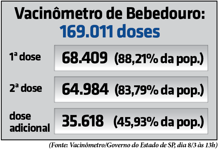 Vacinômetro atualizado pelo governo de São Paulo, às 13h, de terça (8), informa 68.409 bebedourenses com 1ª dose (88,21% da população). 64.984 pessoas receberam 2ª dose ou dose única (83,79% da população) e 35.618 bebedourenses estão com a dose de reforço (45,93%).