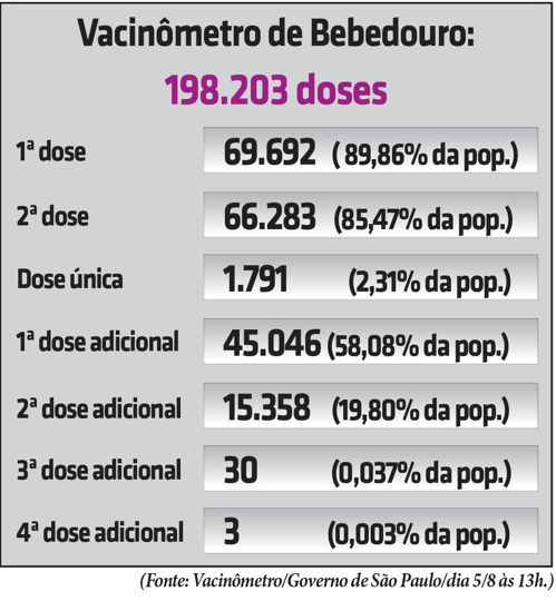 De 2 a 5 de agosto, Bebedouro registrou 153 casos positivos e uma morte em decorrência da Covid-19, de acordo com boletim epidemiológico, divulgado na sexta-feira (5). O mais recente óbito em decorrência da doença aconteceu na rede privada: senhora de 84 anos.