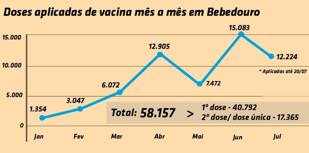 Nesta terça-feira (20), Bebedouro completou seis meses de aplicação de imunizantes contra a Covid-19. Neste período, 17.365 pessoas já receberam duas doses de vacinas ou dose única, o que representa 23,39% da população total de Bebedouro. Segundo o portal “Vacinômetro”, do Governo de São Paulo, 40.792 pessoas já receberam a 1ª dose no município (52,59%), totalizando 58.157 doses aplicadas em seis meses.