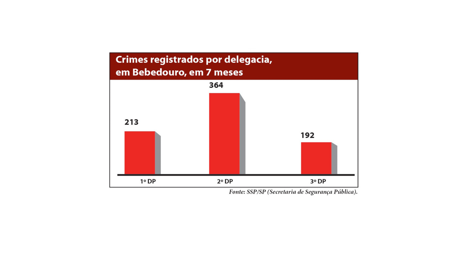 Dados da SSP/SP (Secretaria de Segurança Pública do Estado de São Paulo), referentes aos sete primeiros meses de 2023, mostram que dentre os três distritos policiais de Bebedouro, o 2º, localizado na zona Norte da cidade, é o que mais tem registros de criminalidade, somando 364 neste período. Do total de 769 ocorrências registradas na cidade entre janeiro e julho, a zona Norte acumula 47,33%. Nesta região, aconteceu média de 1,7 crime por dia.