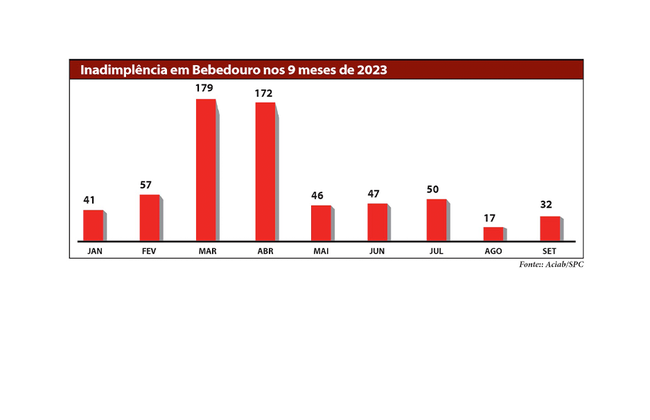 Dados da Aciab (Associação Comercial, Industrial e Agrícola de Bebedouro), através de levantamento de dados inseridos no SPC (Serviço de Proteção ao Crédito), mostram que em setembro, o número de bebedourenses que tiveram seu nome incluso no SPC foi de 32, aumento de 88,23% em relação a agosto, que registrou 17 CPF’s e recuo de 66% em relação a julho, com 50 inclusões no sistema. Já em relação a setembro do ano passado, quando 169 bebedourenses ficaram inadimplentes, o recuo é de 81%.
