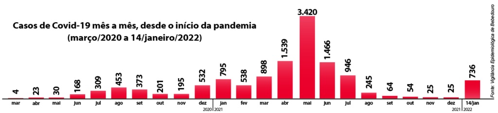 A Gazeta fez levantamento dos casos mês a mês desde quando os primeiros casos diagnosticados em Bebedouro. Em março de 2020 foram quatro confirmados, passando para 23 em abril e 30 em maio. O pior mês de 2020 foi dezembro, com 532 positivados. Em 2021, abril confirmou 1.539 casos e maio, o pior mês, foram 3.420 diagnósticos positivos da doença. Em junho do ano passado foram 1.466 contaminados e o número caiu para apenas 25, em novembro e dezembro.