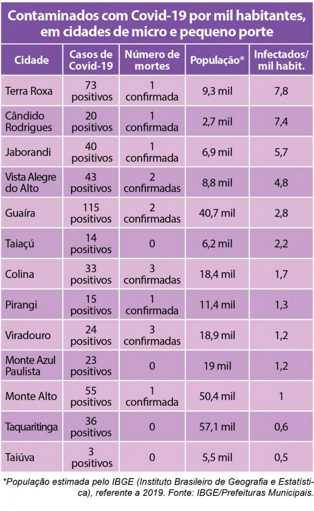 E não são apenas os municípios de médio e grande porte que apresentam índices preocupantes de contaminação por habitante, algumas pequenas cidades da microrregião de Bebedouro, inclusive, apresentam índices ainda mais altos, como é o caso de Terra Roxa, com 9,3 mil habitantes, que com 73 casos e uma morte tem taxa de contaminação de 7,8. Cândido Rodrigues, com 20 casos, um óbito e população de 2,7 mil, apresenta taxa de 7,4/mil.