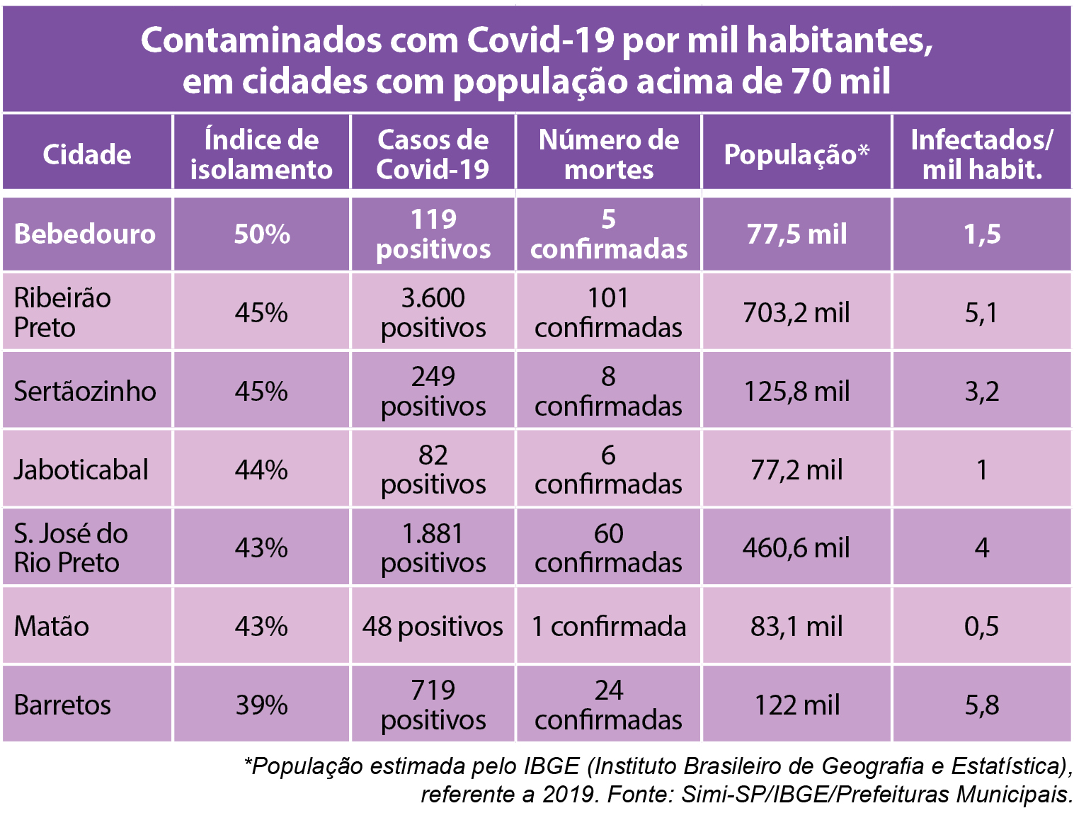 Em Bebedouro, considerando-se os 119 casos positivos e população de 77,5 mil, apontada pela estimativa do IBGE, a taxa de contaminação é de 1,5 para cada mil bebedourenses. Nas demais cidades acima de 70 mil habitantes, as taxas são: Barretos (5,8/mil), Ribeirão Preto (5,1/mil), Rio Preto (4/mil), Sertãozinho (3,2/mil), Jaboticabal (1/mil) e Matão (0,5/mil).