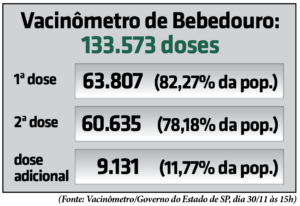 O vacinômetro, atualizado pelo governo de São Paulo, às 12h de terça (30), mostra 63.807 bebedourenses com a primeira dose (82,27% da população). 60.635 pessoas já estão com as duas doses ou dose única (78,18%) e 9.131 pessoas tomaram a dose de reforço (11,77%).
