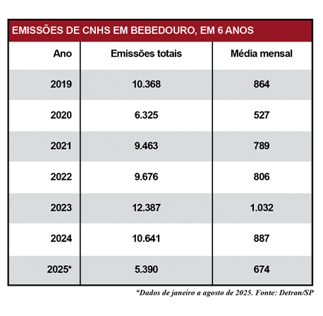 Entre janeiro e agosto de 2025, Bebedouro registrou emissão de 5.390 CNHs (Carteiras Nacionais de Habilitação), segundo dados oficiais do Detran-SP. O número representa 50,6% do total registrado em todo o ano de 2024, quando foram emitidas 10.641 habilitações no município.