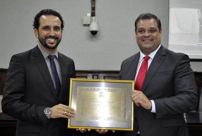 O advogado e empresário Luciano de Oliveira emocionou-se na cerimônia em que recebeu o título de ‘Cidadão Bebedourense’, na noite de sexta-feira (11), na Câmara Municipal.