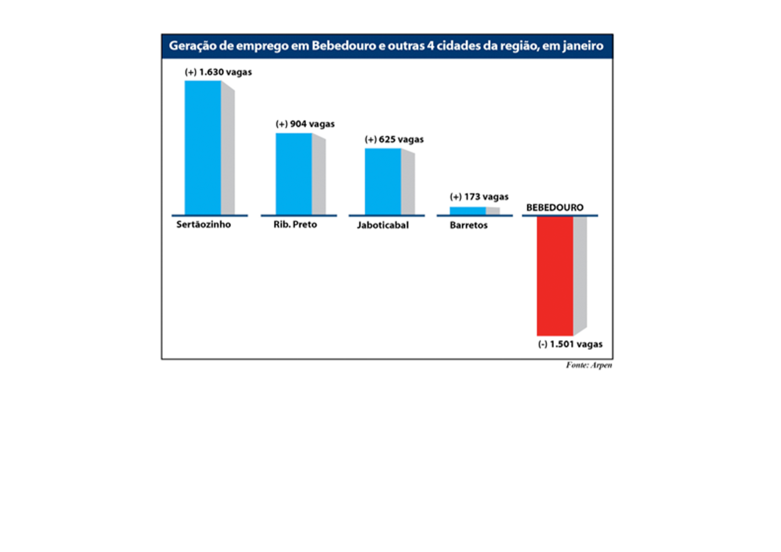 Dados do Caged (Cadastro Geral de Empregados e Desempregados), do Ministério da Economia, mostram que Bebedouro, na comparação com outras quatro cidades da região, é a única a fechar janeiro com saldo negativo de empregos: (-) 1.501 vagas, enquanto Sertãozinho obteve o melhor resultado: (+) 1.630. A Gazeta também analisou os dados gerais e por setores de Jaboticabal, Barretos e Ribeirão Preto.