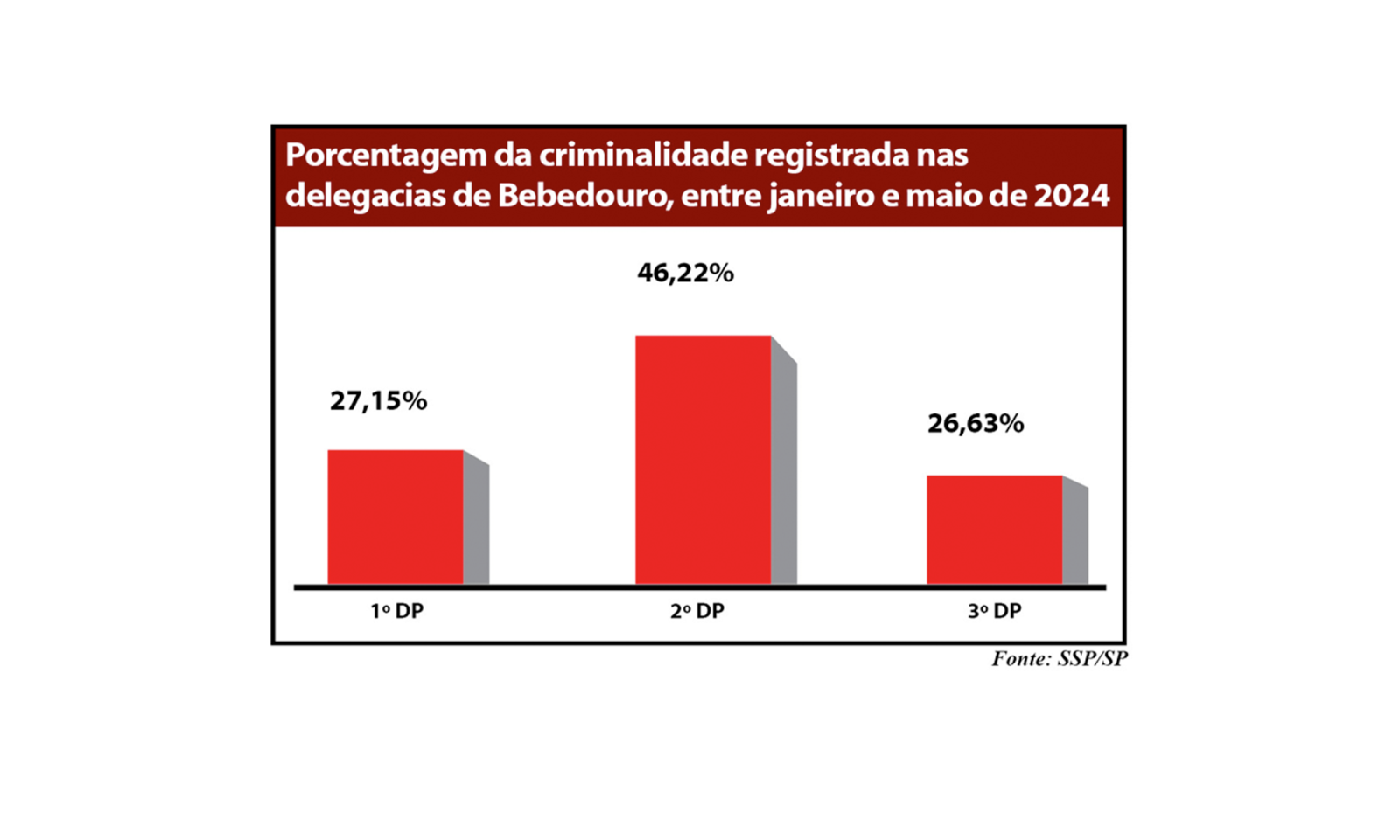 A SSP/SP (Secretaria de Segurança Pública do Estado de São Paulo) divulgou dados das estatísticas criminais referentes ao período de janeiro a maio deste ano, por delegacia. Em Bebedouro, na zona Norte, o 2º DP tem maior número de registros de criminalidade, totalizando 269, representando 46,22% do total de ocorrências. No 1º DP, os registros foram 158, representando 27,15% do total e na zona Sul, o 3º DP, registrou 155, ou 26,63% do total.