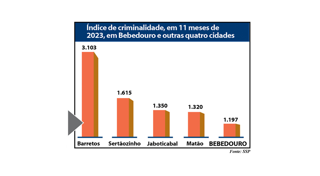 Dados da SSP/SP (Secretaria de Segurança Pública do Estado de São Paulo), referentes ao período de janeiro a novembro de 2023, mostram que Bebedouro é a cidade com menor índice de criminalidade dentre cinco cidades da região, incluindo Jaboticabal, Sertãozinho, Matão e Barretos, as sempre analisadas pela Gazeta. Os furtos foram os mais registrados em todas as cidades.