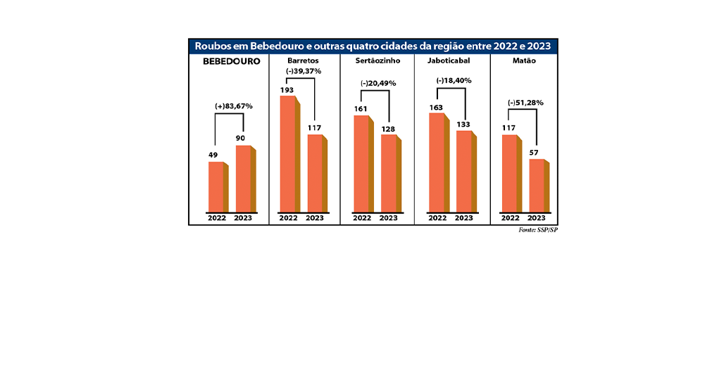 A Gazeta analisou os dados de Bebedouro e outras quatro cidades da região: Barretos, Sertãozinho, Jaboticabal e Matão, em relação às estatísticas criminais, divulgadas pela SSP/SP (Secretaria de Segurança Pública do Estado de São Paulo). Conforme noticiado na edição 10.817, de 31 de janeiro da Gazeta, os roubos foram 90, em Bebedouro, no ano passado, crescimento de 83,67% em relação aos 49 registrados em 2022. As cidades pesquisadas da região pela Gazeta caminham na direção contrária e têm queda no registro deste tipo de crime.