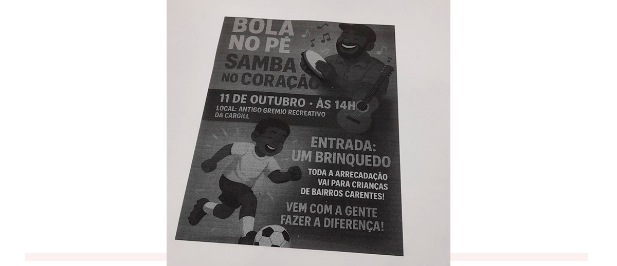 O espírito de solidariedade e união vai marcar o evento “Bola no Pé, Samba no Coração”, no próximo dia 11 de outubro, a partir das 14h, no antigo Grêmio Recreativo da Cargill. A iniciativa beneficente surgiu de um almoço em família e ganhou força com a ideia de transformar uma simples partida de futebol entre amigos em gesto de solidariedade.
