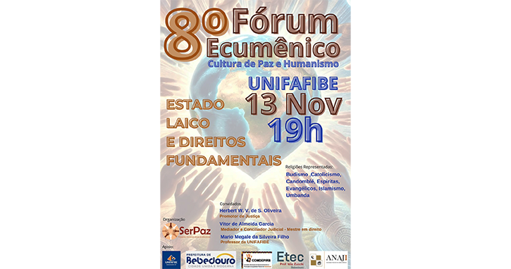 O Conselho Municipal de Promoção e Desenvolvimento da Igualdade Racial de Bebedouro (COMDEPIRB) em parceria com o Grupo Ser Paz, promove na quarta-feira (13), a partir das 19h, o Fórum Ecumênico 2024, no Centro Universitário Unifafibe.