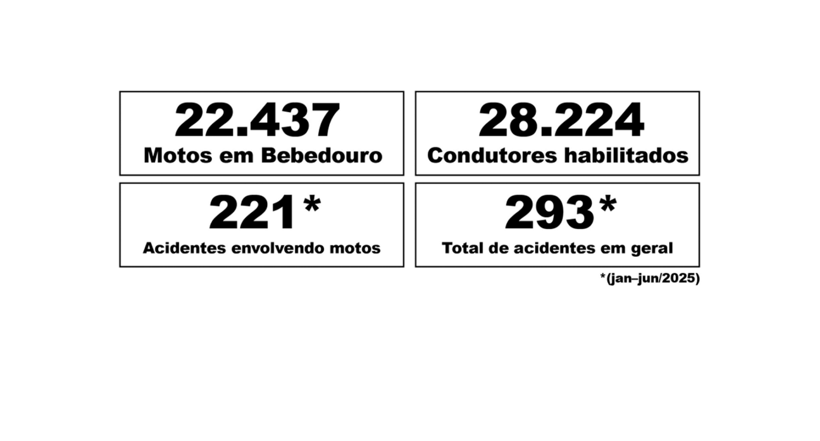 Bebedouro possui 22.437 motocicletas em circulação, considerando a soma de motocicletas (14.144) e motonetas (8.293), o que representa quase 30% de toda a frota do município, conforme aponta o relatório de julho de 2025, divulgado pelo Departamento Municipal de Trânsito e Transporte, a pedido da Gazeta. Com este alto volume de motos, 28.224 condutores estão legalmente habilitados a pilotá-las, segundo dados fornecidos pelo Detran-SP. Esse número corresponde à soma dos motoristas que possuem CNHs das categorias que autorizam a condução de motos, como CNH A (750 condutores) e CNH AB (27.474 condutores). Fazendo as contas há 0,79 moto para cada habilitado, ou seja, são mais condutores, (+) 25,7%, que a quantidade de motos registradas na cidade.