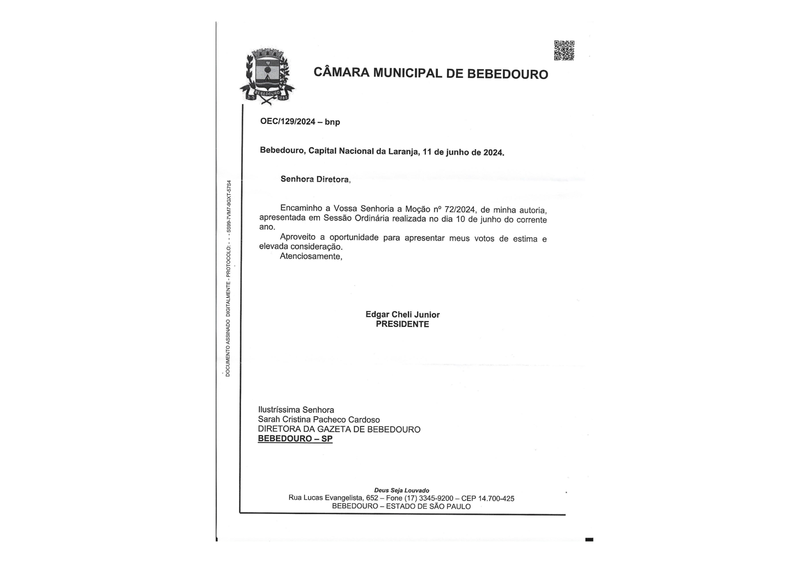 O presidente da Câmara Municipal Edgar Cheli (UB) concedeu ‘moção de congratulação e aplausos’ a Gazeta de Bebedouro, em reconhecimento aos 100 anos de serviços prestados à população bebedourense, comemorado em 6 de junho deste ano.