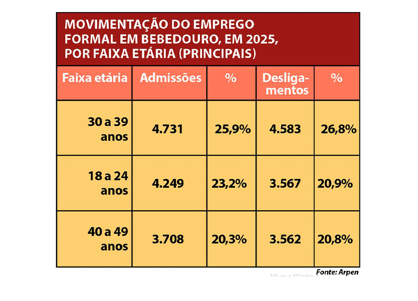 Os dados do Caged apontam que Bebedouro registrou 18.305 admissões formais ao longo dos 12 meses de 2025. O levantamento evidencia predominância masculina nas contratações, além de forte concentração de oportunidades entre trabalhadores com ensino médio completo e idade situada principalmente entre 30 e 39 anos, indicando o perfil predominante da força de trabalho que ingressou no mercado formal durante o período.