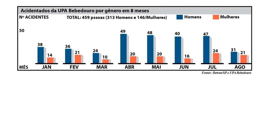 De janeiro a agosto de 2025, a UPA de Bebedouro atendeu 459 vítimas de acidentes de trânsito. A cada dez, sete eram homens. O dado chama atenção quando comparado à quantidade de motoristas habilitados: segundo o Detran, Bebedouro tem 40.195 condutores com CNH ativa, sendo 21.906 homens (54,5%) e 18.289 mulheres (45,5%). Apesar da diferença numérica relativamente equilibrada, o risco de acidentes é maior para eles: enquanto há uma vítima masculina para cada 70 motoristas homens, entre as mulheres a proporção cai para uma a cada 125 habilitadas.