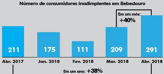 A inclusão de pessoas de Bebedouro no SPC (Serviço de Proteção ao Crédito) apresentou crescimento de 39,23% no mês de abril em relação a março: (291 x 209). No comparativo com igual mês de 2017, o aumento é de 37,91%: (291 em 2018 x 211 em 2017).