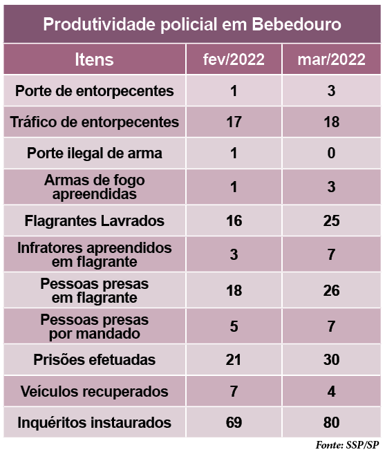 O número de inquéritos instaurados em Bebedouro caiu 11,81% no primeiro trimestre deste ano, com 209 aberturas ante 237 no mesmo período de 2021. Entretanto, na comparação mensal, houve alta de 15,94% em março, no comparativo com fevereiro: (80 x 69), segundo dados da Produtividade Policial, divulgados pela Secretaria de Segurança Pública de São Paulo.
